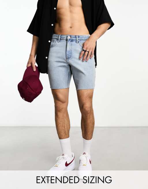 Mens denim shorts asos clearance, ASOS DESIGN shorter length denim shorts in 90s mid wash with rip detail and raw hem clearance