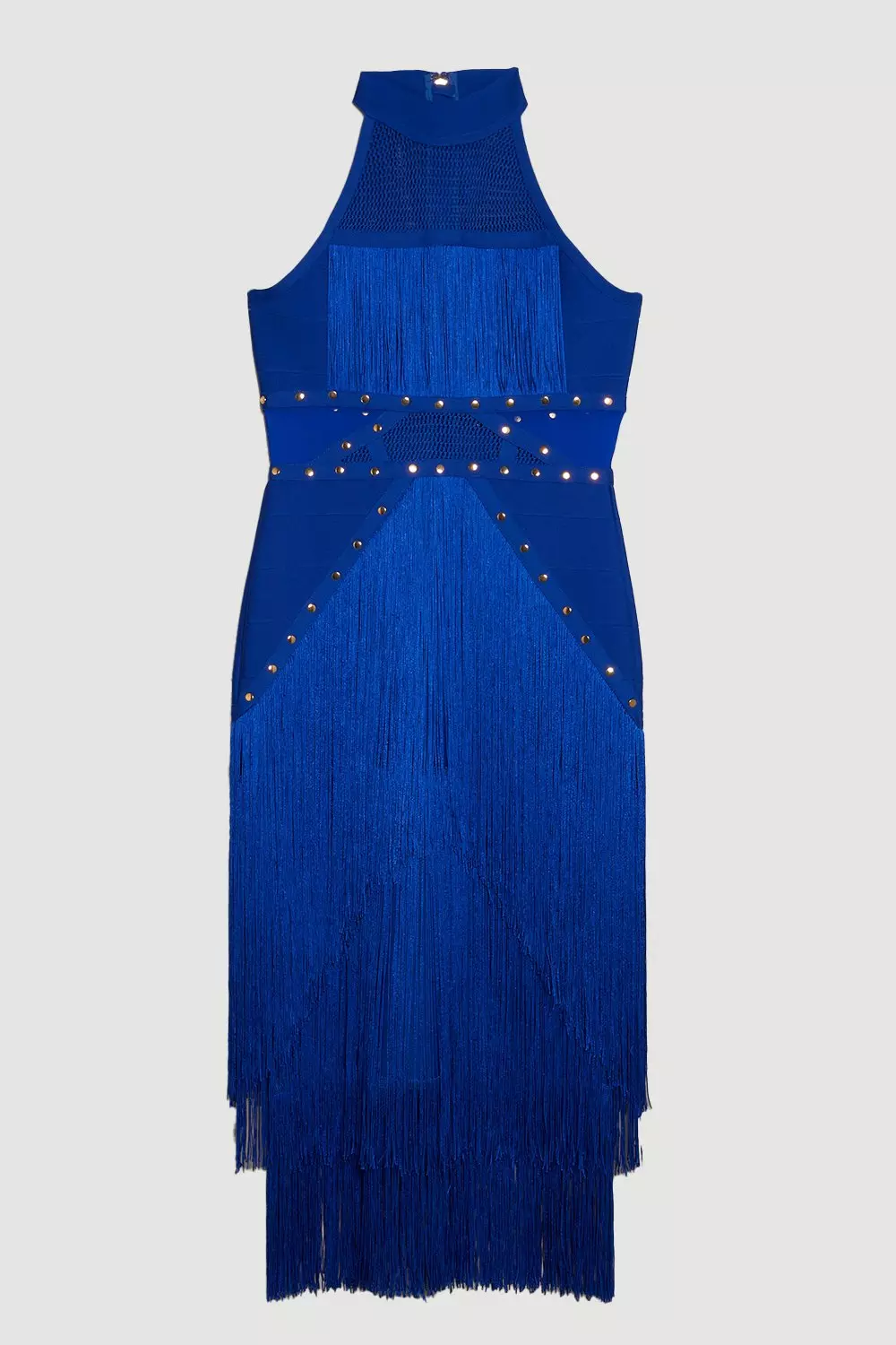 Studded Fringe Mesh Insert Knit Halterneck Bandage Midi Dress