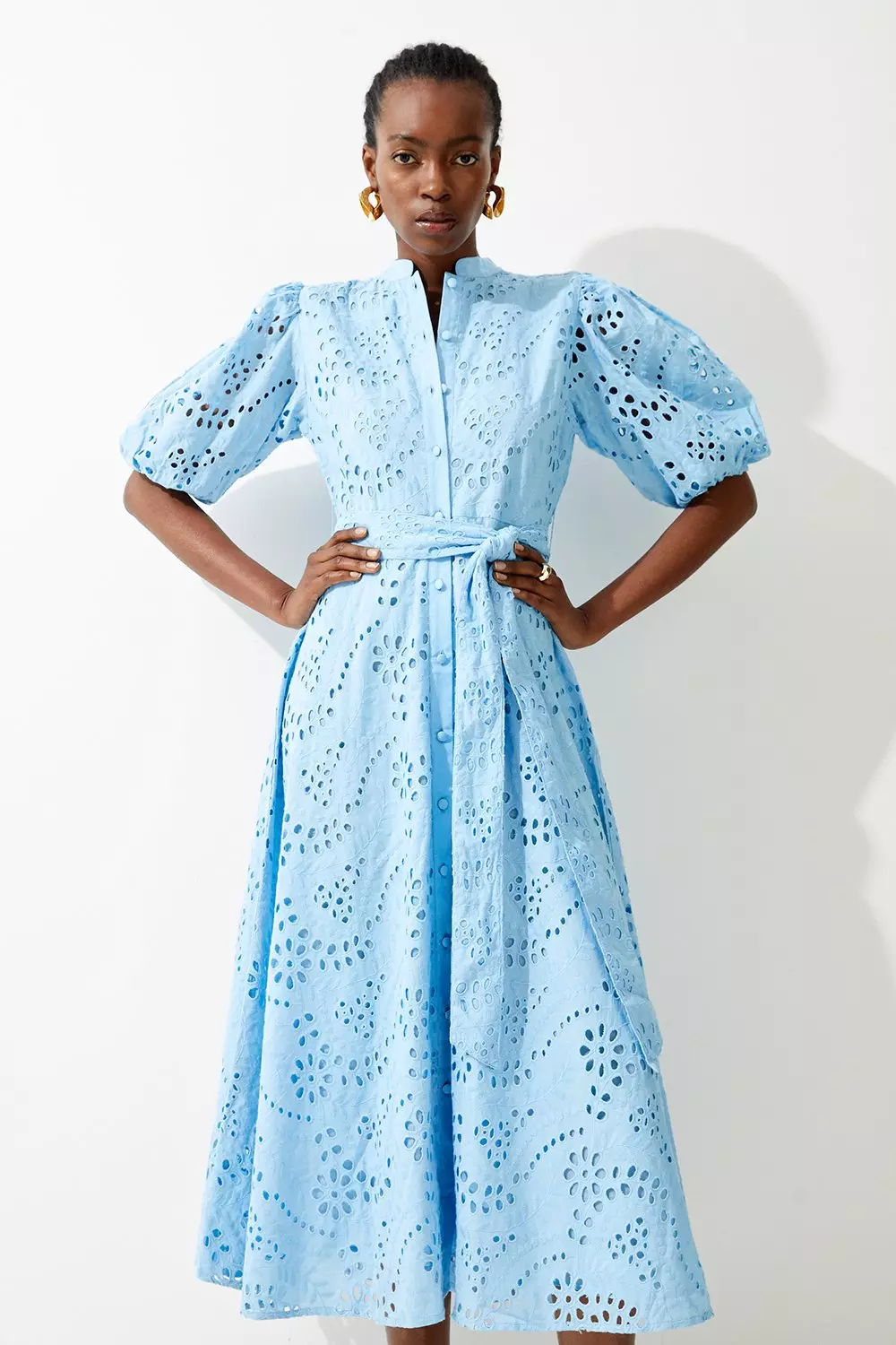 Cotton Broderie Belted Woven Midi Dress Karen Millen