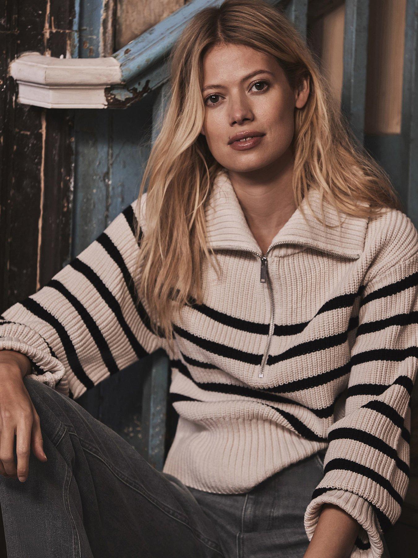 Mint Velvet Zip Neck Striped Jumper Natural Black XS