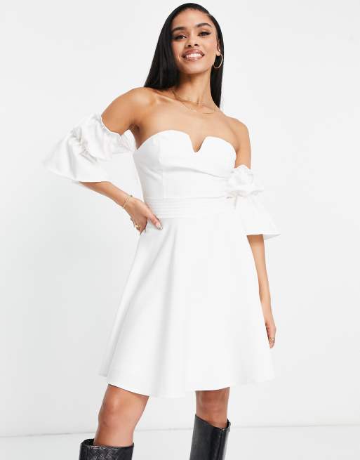 Miss selfridge bardot skater dress in white clearance, Miss Selfridge tiered cutwork puff sleeve mini dress in white clearance
