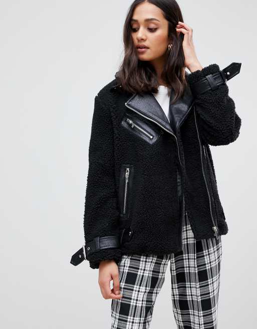 Miss selfridge borg biker jacket clearance, ASOS Miss Selfridge Women s Black Faux Shearling Longline Borg clearance