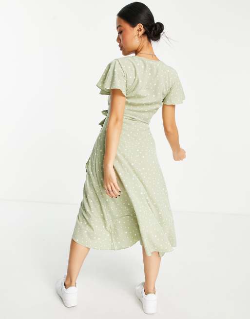 Missguided Petite wrap front tea midi dress in sage spot print ASOS