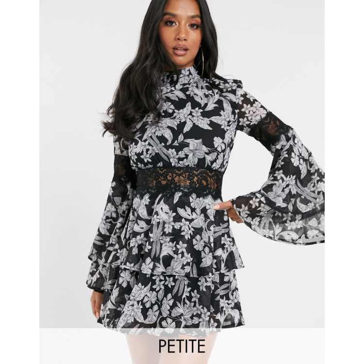 Missguided Petite high neck skater dress with frill sleeves in black floral print