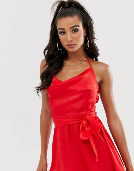 Missguided satin skater dress with cowl halterneck in red