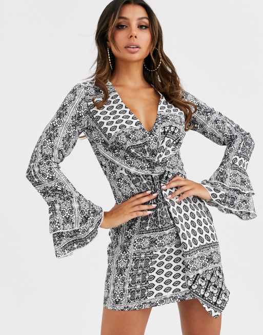 Missguided wrap tea dress with ruffle in mixed scarf print ASOS