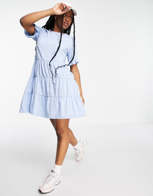 Missguided tiered dress clearance, Missguided tiered smock dress with frill sleeve in blue ASOS clearance