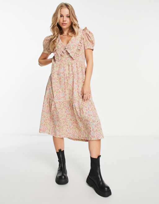 Monki floral dress clearance, Monki floral print tiered midi dress with collar detail in multi floral print clearance