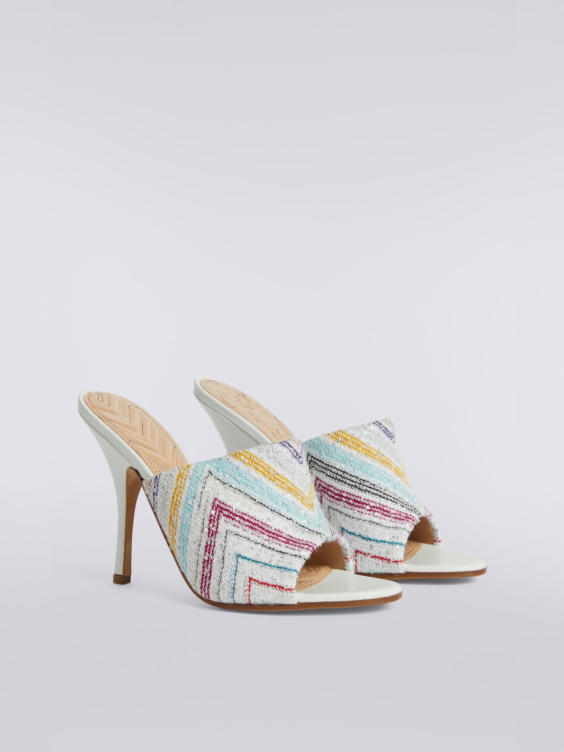Mule sandals with zigzag fabric heel and sequin appliqu