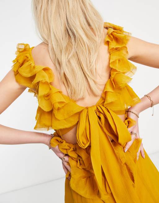 ASOS DESIGN tiered ruffle mini dress with tie back in mustard ASOS