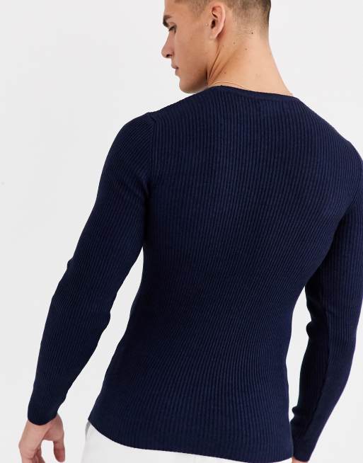 ASOS DESIGN muscle fit ribbed sweater in navy