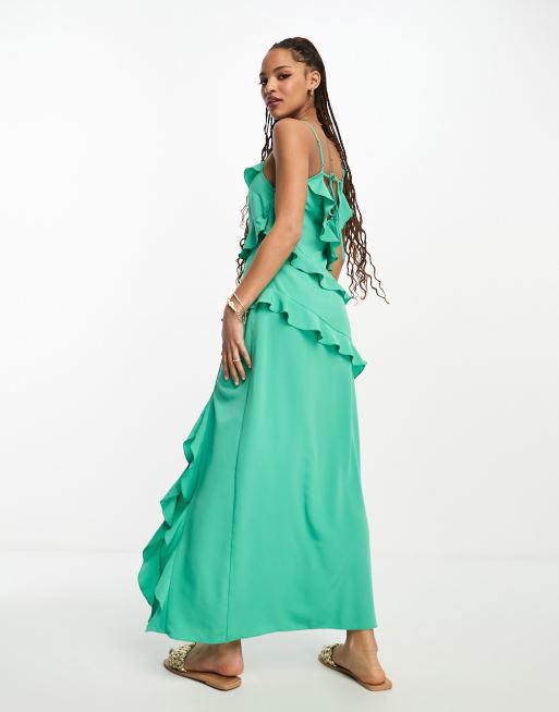 New look gown clearance, New Look side split satin ruffle midi dress in green ASOS clearance