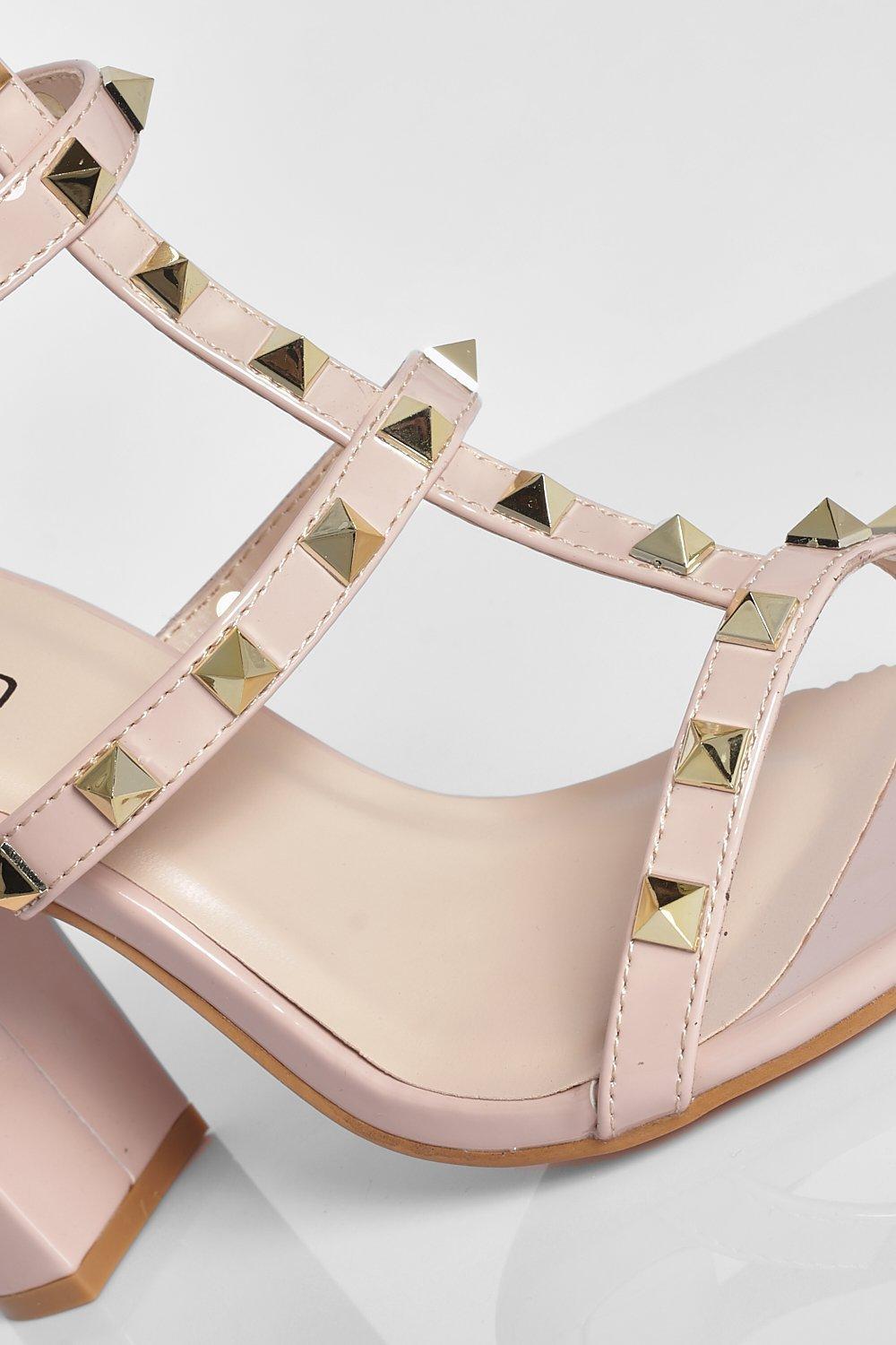 Nude studded block heels clearance, Patent Studded Block Heel Sandal Boohoo UK clearance