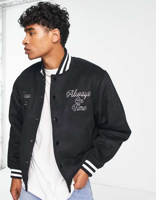 Obey Time varsity bomber jacket in black with chest and back