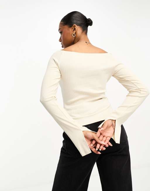 Monki ribbed boat neck long sleeve top with slits in off white ASOS