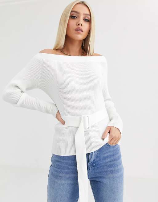 PrettyLittleThing bardot jumper with belt in white ASOS