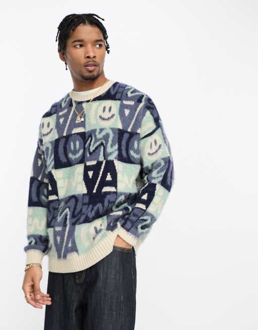 ASOS DESIGN knitted brushed sweater with all over print in blue ASOS