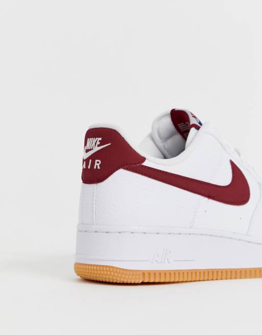 Nike Air Force 1 trainers with red swoosh and gum sole