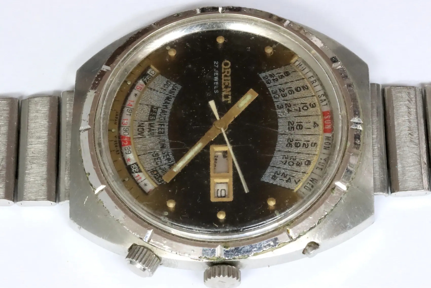 Vtg Orient Day Date Calendar Automatic 27 Jewel BIG Face 42x45mm