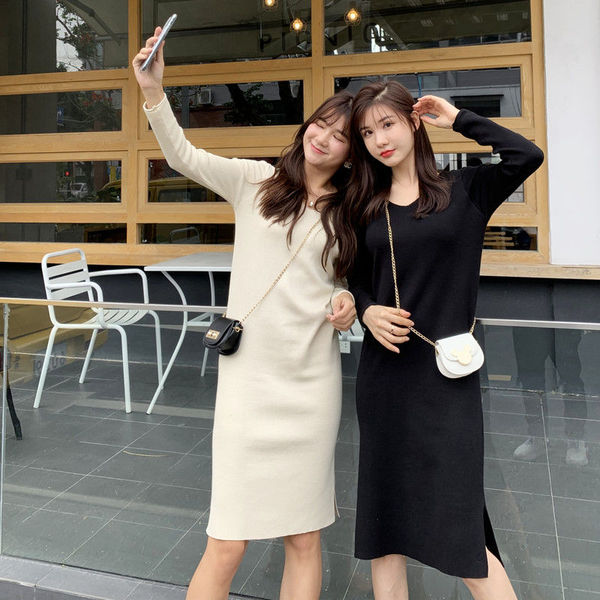 Autumn Women s Clothing All match Solid Color Dresses Long Sleeve