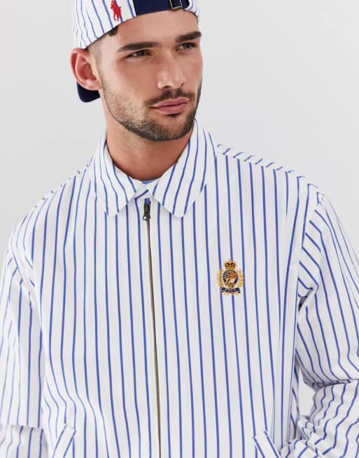 Polo Ralph Lauren Bayport crest badge stripe oxford lightweight harrington jacket in white blue
