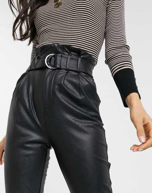 Stradivarius Pantalon en similicuir taille haute fronc e avec ceinture Noir