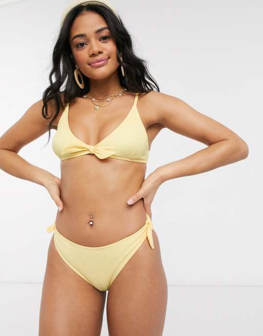 New Look crinkle bow front bikini bottom in pastel yellow