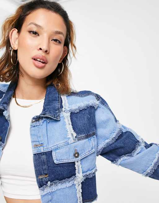 Patchwork denim jacket womens clearance, The Ragged Priest cropped denim jacket in patchwork denim co ord clearance