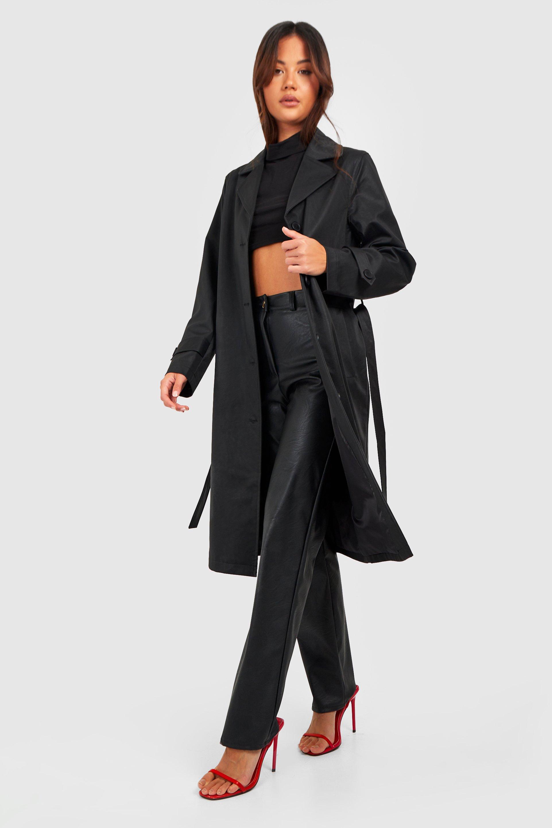Petite Black Faux Leather Sleeve Detail Trench Coat