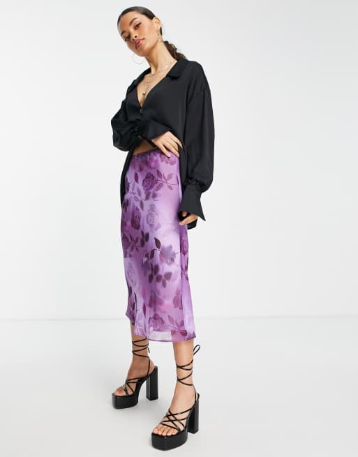 ASOS DESIGN Petite 90s low rise midi slip skirt in purple floral print