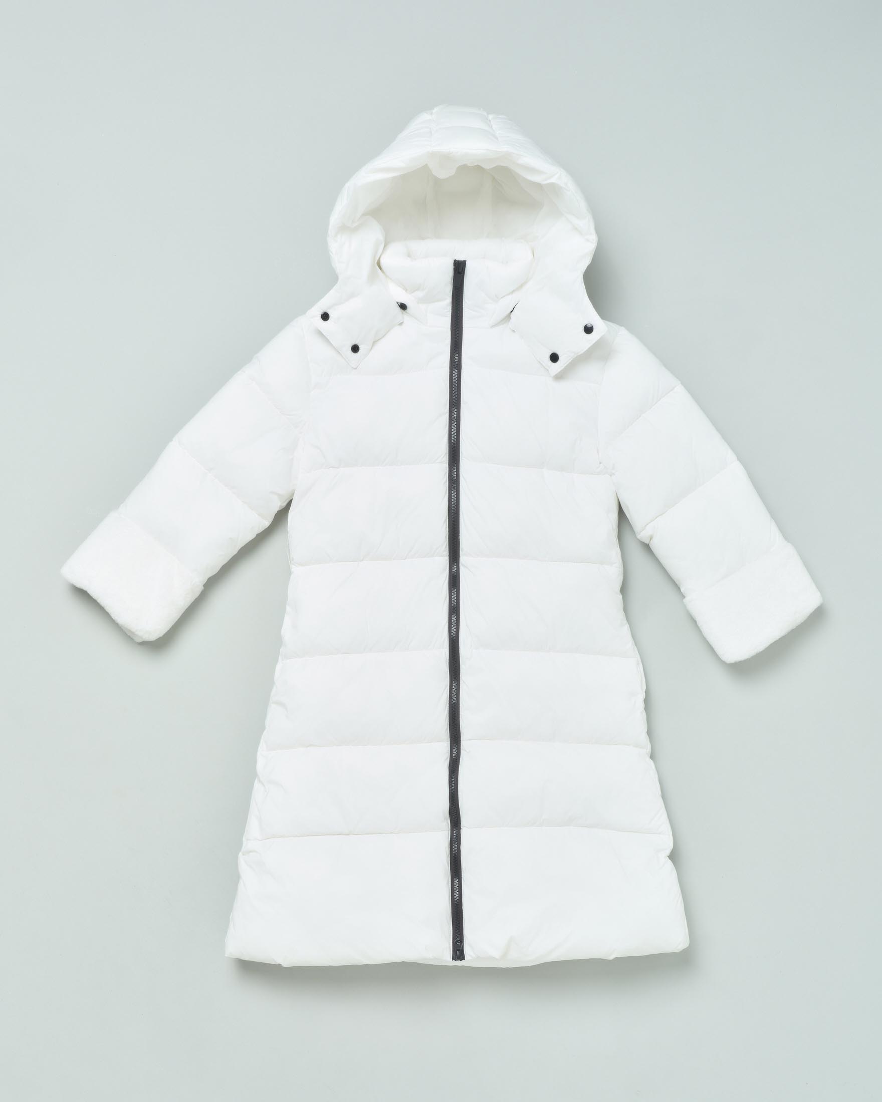 Piumino bianco lungo clearance, Piumino lungo bianco con cappuccio removibile polsini in clearance
