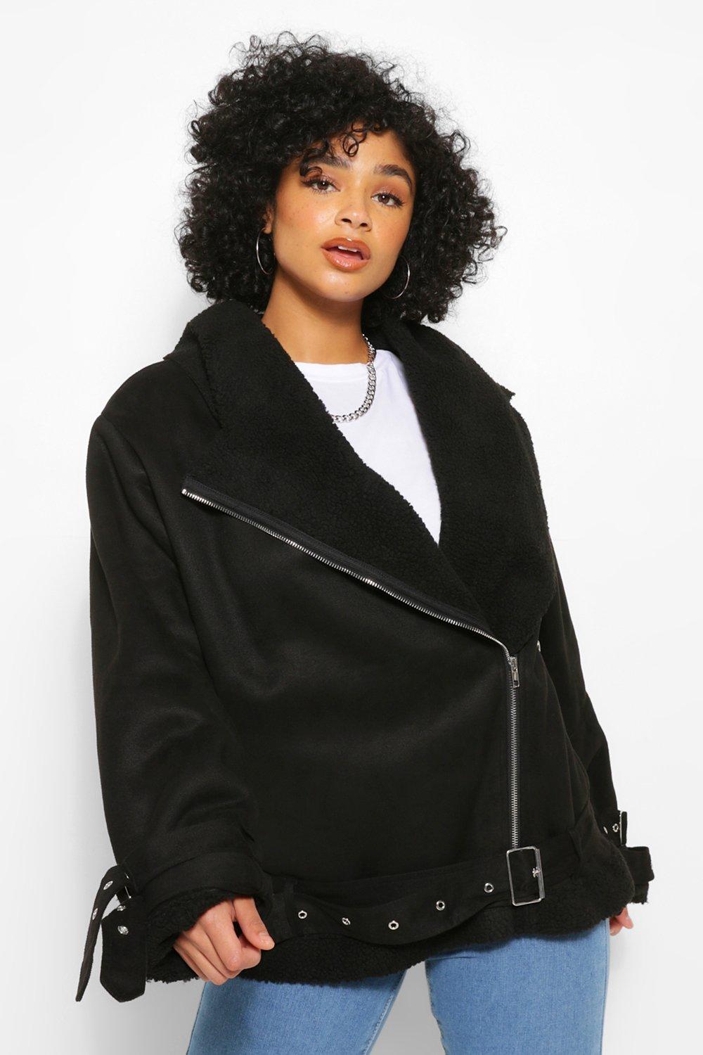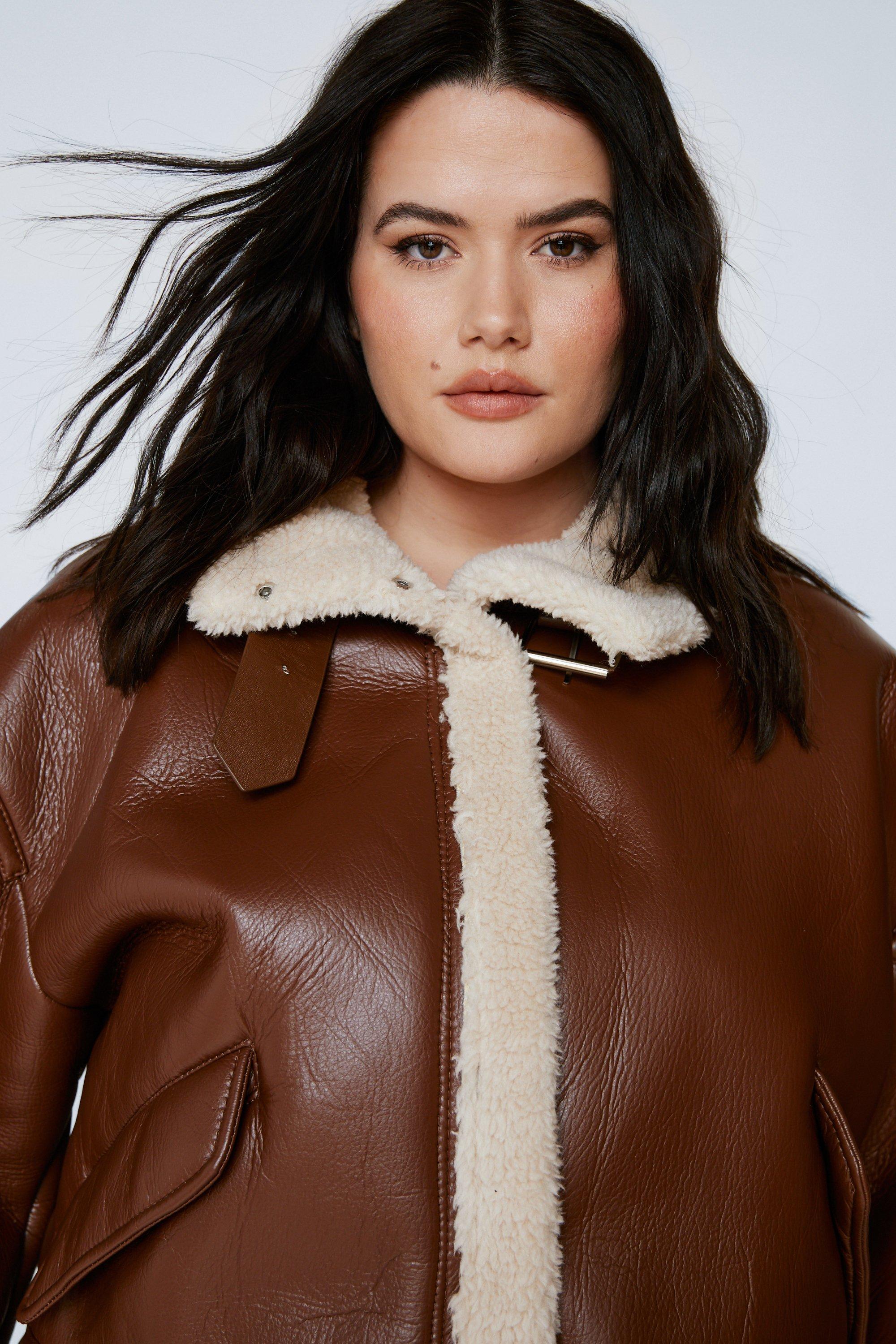 Women s Plus Faux Leather Lined Oversized Aviator Jacket Boohoo UK