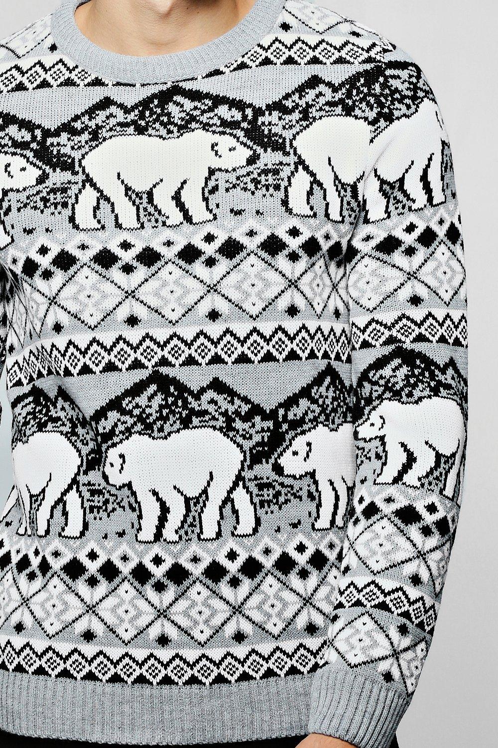 Men s Christmas Polar Bear Fair Isle Jumper In Grey Boohoo UK