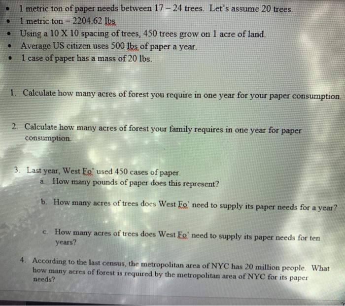 Solved 1 metric ton of paper needs between 17 24 trees. Chegg
