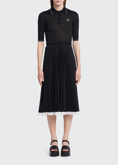 Prada Pleated Polo Midi Dress In F0002 Nero ModeSens
