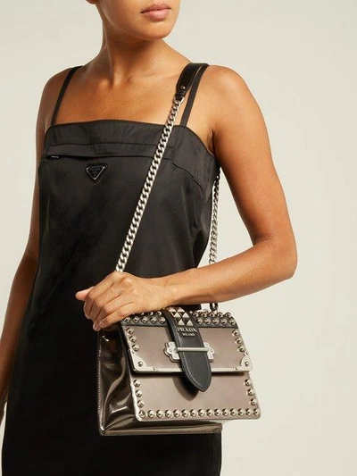 Prada Cahier Metallic leather Studded Shoulder Bag In Silver
