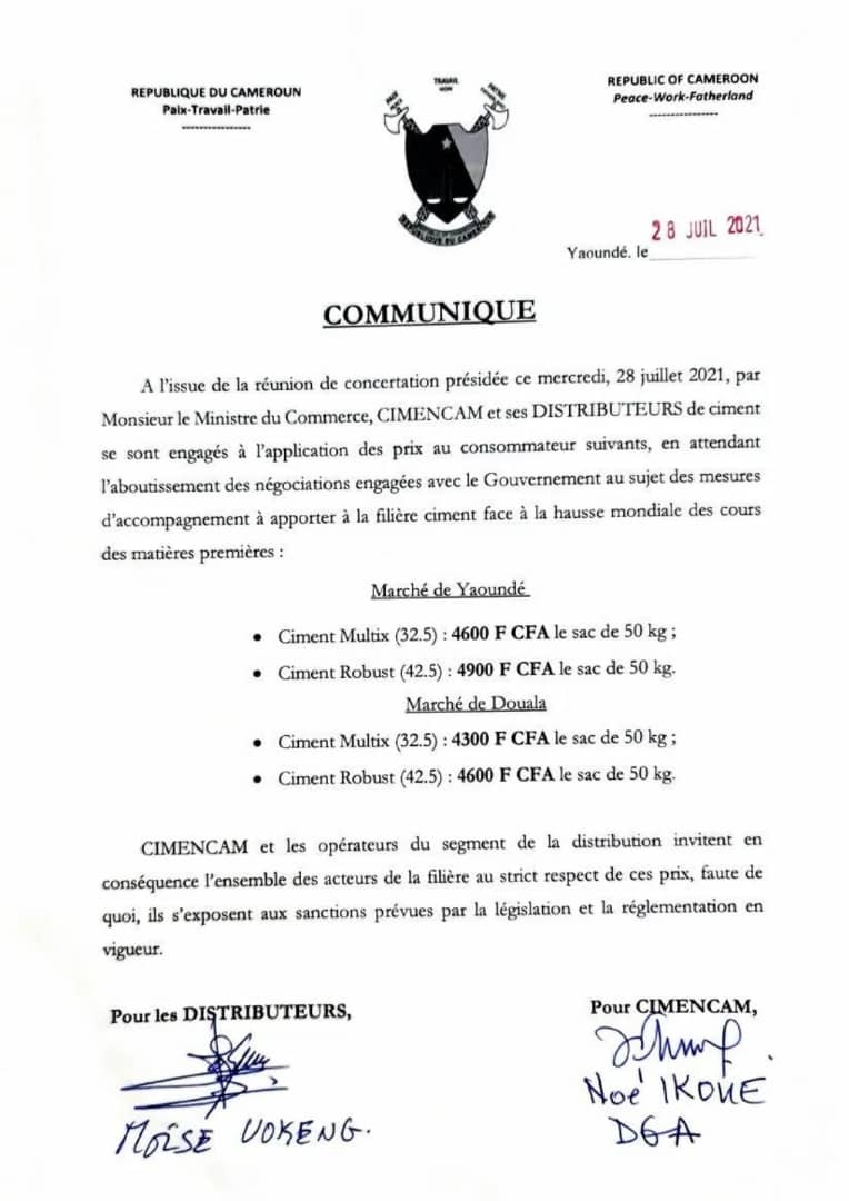 Ciment Voici les nouveaux prix arr t s pour Yaound et Douala