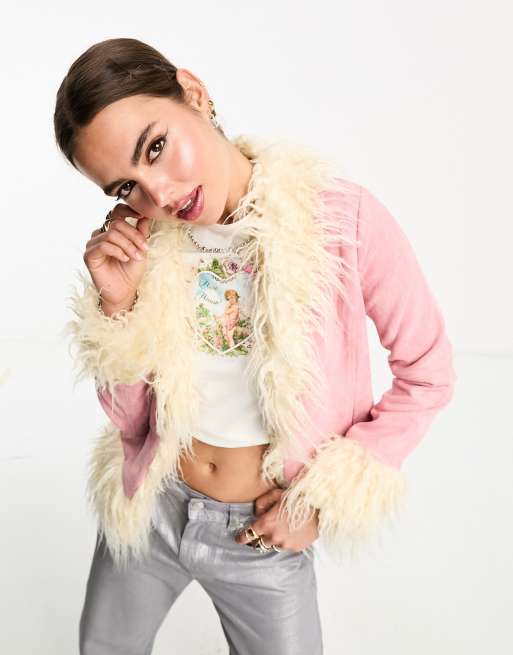 Rose faux fur jacket clearance, Bailey Rose 70s faux suede fluffy trim pink coat clearance