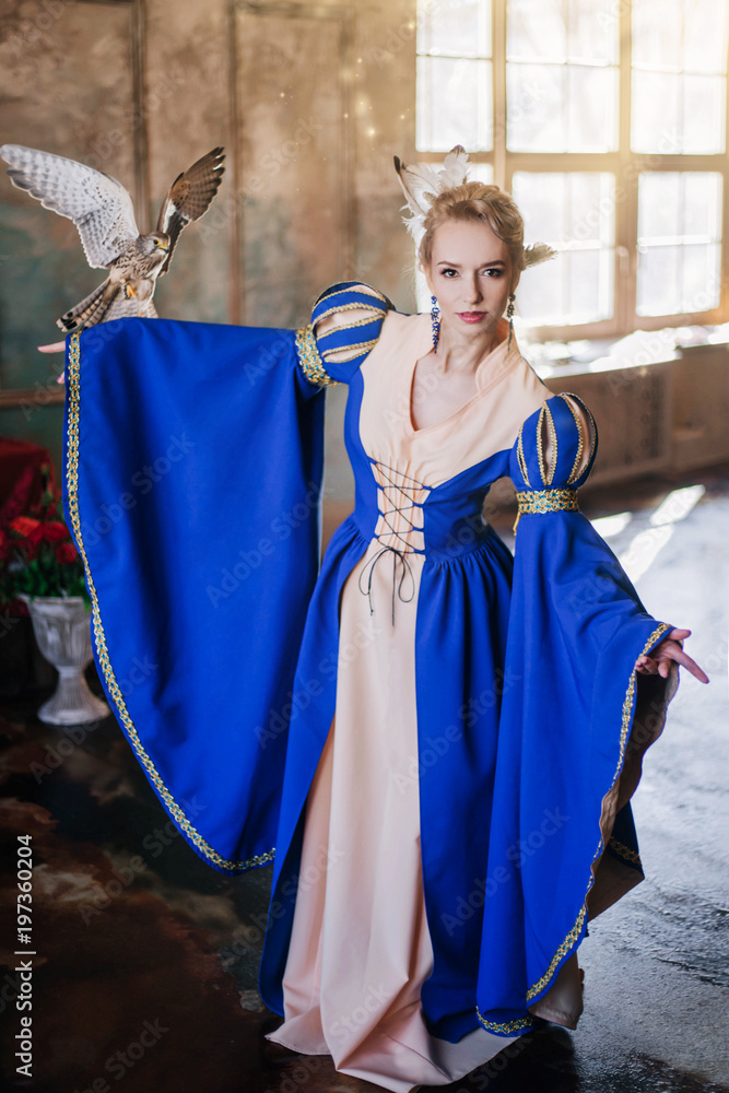 Royal blue medieval dress clearance, Beautiful girl in a medieval dress in blue. A model with white clearance