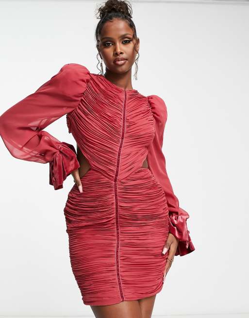 ASOS LUXE ruched chiffon cut out back mini dress in wine