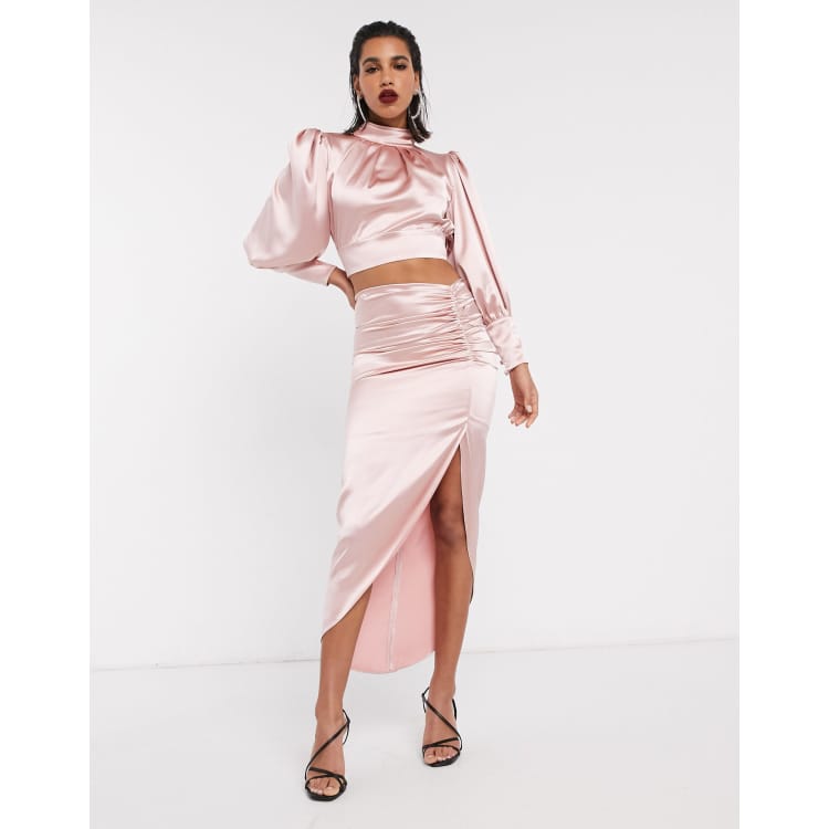 Per Favore Champagne Satin Ruched Split Maxi Skirt Club L London