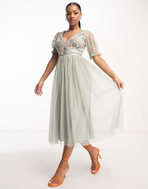Maya ruffle sleeve midi dress with embroidery in sage
