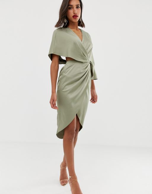 ASOS DESIGN satin kimono midi dress with knot front and asymmetric sleeve