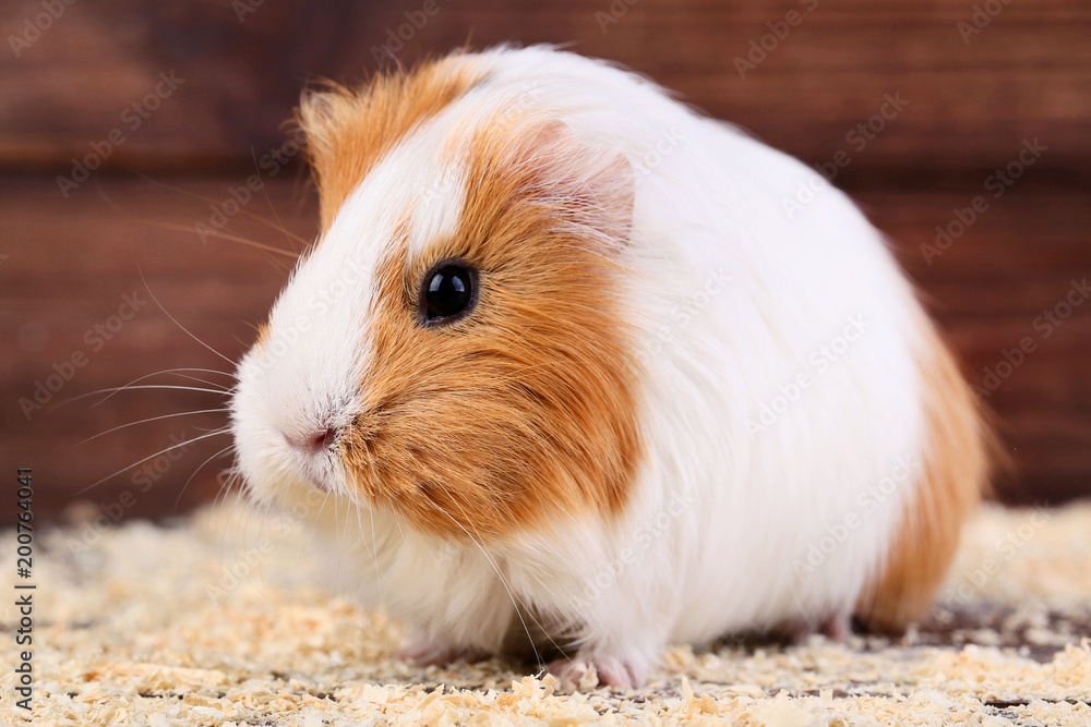 Guinea pig with sawdust on brown background Stock Photo Adobe Stock