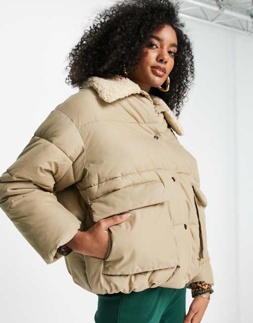 Topshop mid length puffer jacket with sherpa collar in camel ASOS