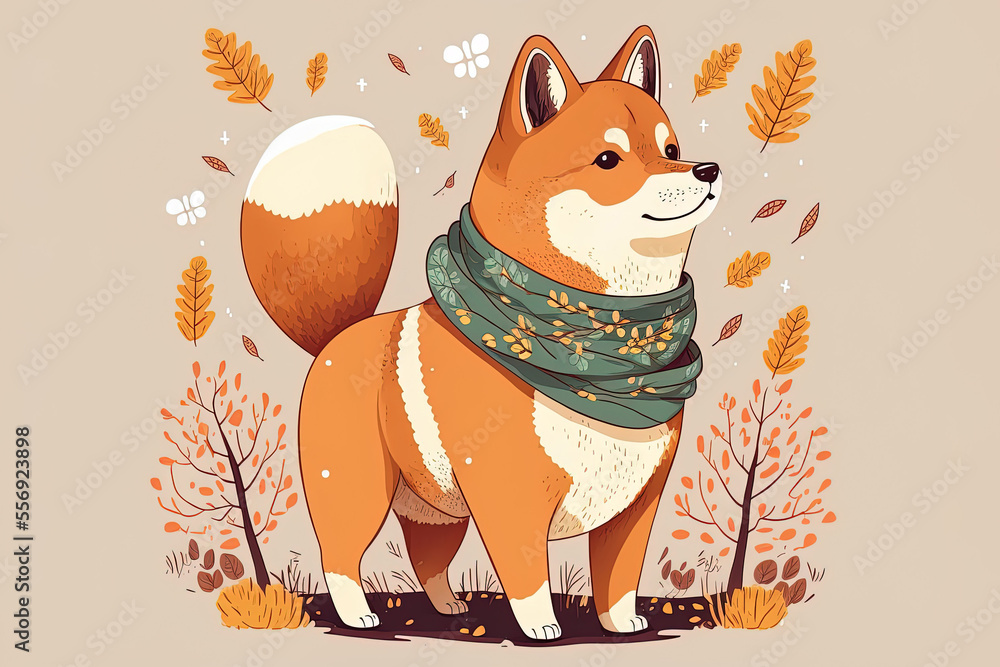 adorably drawn shiba inu dog wearing a scarf cartoon symbol an