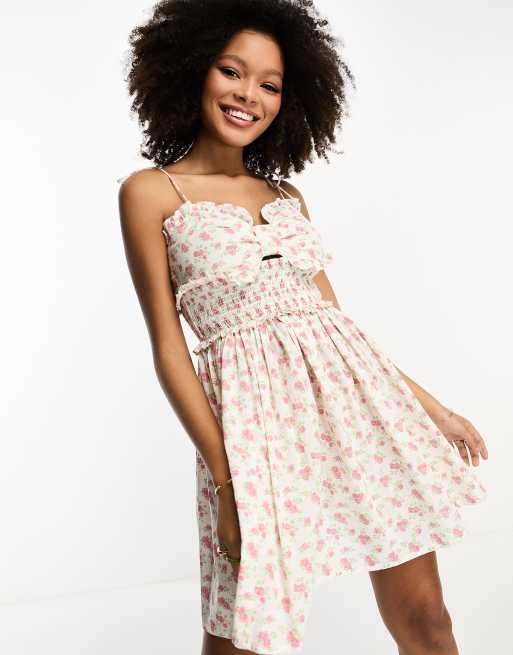 ASOS DESIGN bow bust shirred waist mini sundress in pink ditsy print