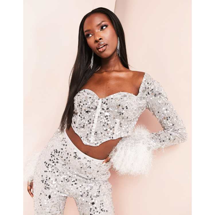 ASOS Luxe sweetheart neck faux feather trim sleeve sequin crop top