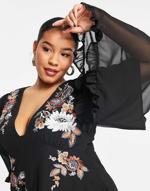 ASOS Curve CURVE PREMIUM Midi Skater Dress With Floral Embroidery