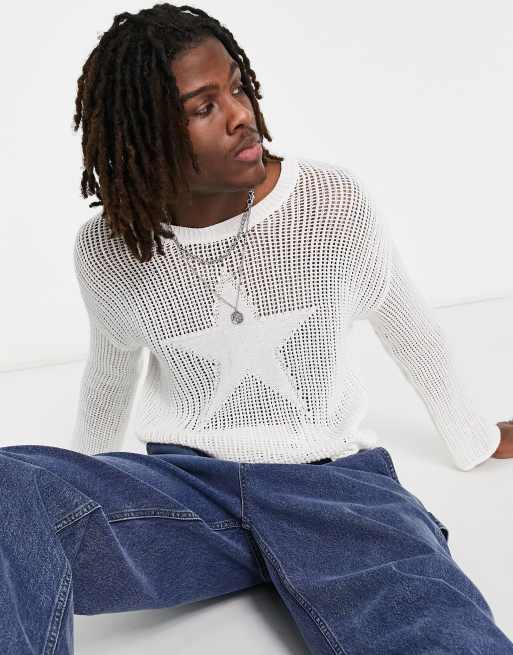 Jaded London open knit jumper with star in white ASOS